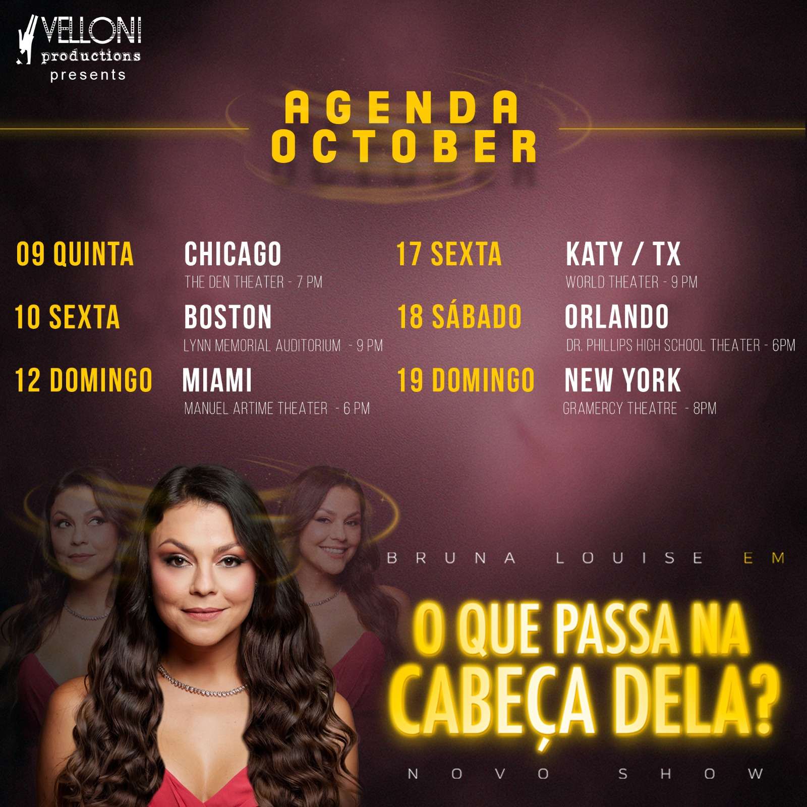 “Estou muito animada com essa minha primeira turnê nos Estados Unidos. Sempre soube do carinho da comunidade brasileira que vive no país e, em breve, vou poder sentir essa energia nas apresentações. Vai ser uma chance incrível de levar o nosso humor para quem quer matar a saudade de casa. Vamos dar boas risadas e nos emocionar juntos”, afirma Bruna Louise.