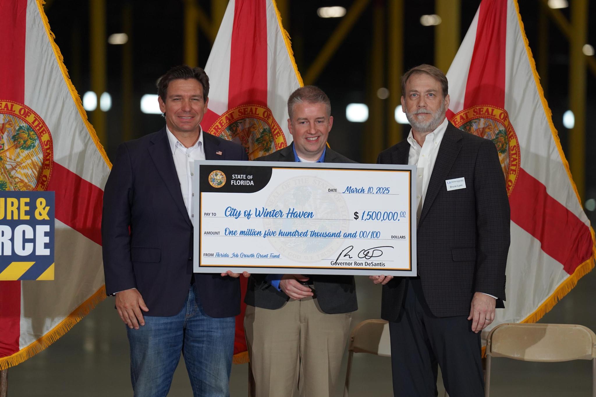 O governador da Flórida, Ron DeSantis, entregou um cheque de US$ 1,5 milhão para Winter Haven expandir o acesso ferroviário no Central Florida Intermodal Logistics Center. O investimento faz parte do fundo de crescimento do estado e visa otimizar a cadeia de suprimentos na região.